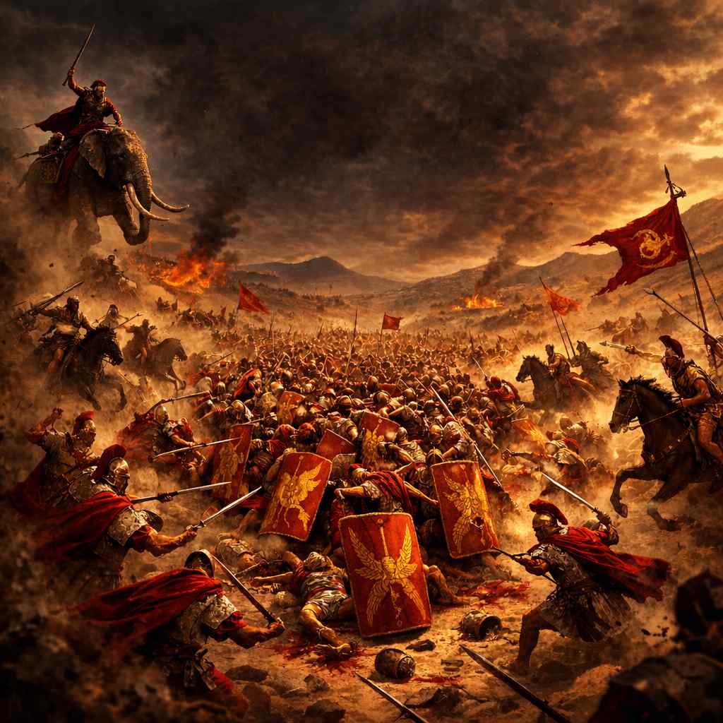 The Battle of Cannae (August 2, 216 BC) was a devastating defeat for Rome during the Second Punic War. Carthaginian general Hannibal Barca used a double envelopment tactic — encircling a larger Roman force — resulting in the death of between 45,000 and 70,000 Roman soldiers in a single afternoon.